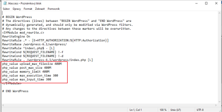 V tomto môžete definovať maximálnu veľkosť nahrávaného súboru. Nahraďte čísla podľa vašich preferencií. Položka max execution a max input sú v sekundách. Execution time definuje limit času, ktorý je využitý na samotný script. Kľudne si vyberte čísla, ktoré Vám vyhovujú. Ja som potrebovala veľkosť na 400 MB, ako môžete vidieť v Obrázku 1.